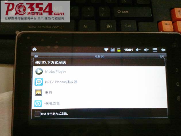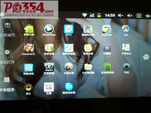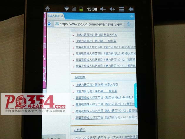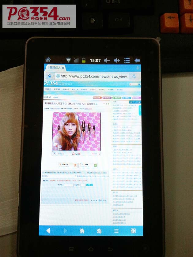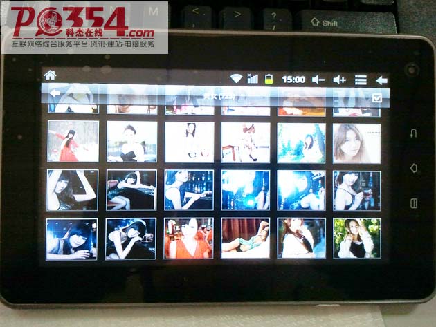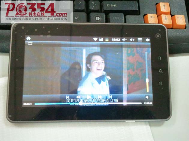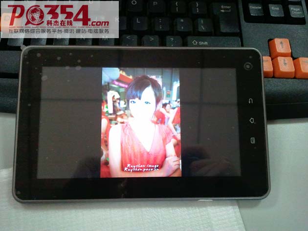 簡單試用了看圖、電影、拍照(只有一個前置攝像頭30萬相素,我就不放圖了,質量嘛你想去吧,只用來QQ視頻試了下,一個字:勉強用用),WIFI上網速度很不錯,信號比我的手機差不多,感覺還要稍好點(公司路由器離我大概10米,信號2格(共3格),家里路由器更近,滿格)。