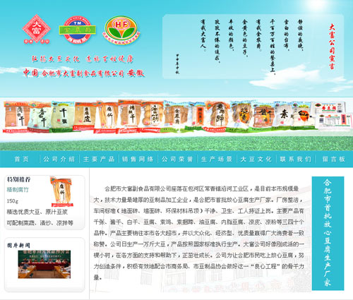 合肥市大富副食品有限公司(網址:http://www.hfdafu.com)座落在包河區常青鎮沿河工業區,占地五畝三分六.是目前本市規模最大,技術力量最雄厚的豆制品加工企業,是合肥市首批放心豆腐生產廠家.廠房整潔,車間標準(地面磚、墻面磚、環保材料吊頂)干凈、衛生、工人持證上崗.主要產品有 千張、醬干、白干、豆腐、素雞、素捆蹄、油豆腐、內脂豆腐、涼皮、涼粉等三四十個品種.產品主要銷往本市各大超市,并以大眾化、經濟型、優質量贏得廣大消費者一致稱贊.公司日生產一萬斤大豆,產品按照國家標準執行生產.大富公司好像剛成活的一棵小樹,在各方面的支持和幫助下,正茁壯成長.公司為讓合肥市民吃上放心豆腐,努力創造條件,積極有效地配合市商務局、市豆制品協會做好這一“良心工程”的骨干力量。