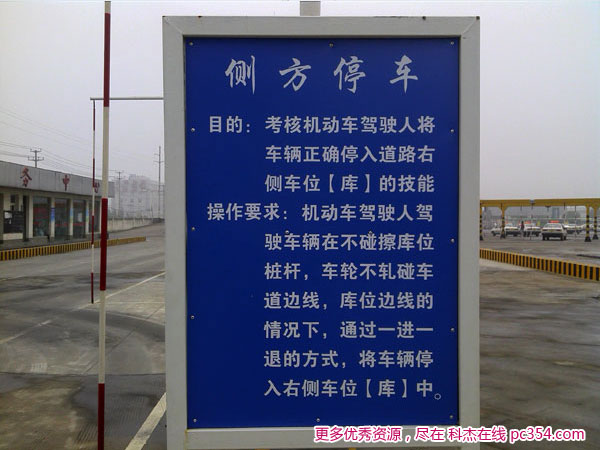 今天下午去的時候先練習了一會繞8字,不能壓邊,問了教練,也沒有像倒樁時那樣的參考點了,只能憑感覺,繞了10來圈吧,進行下一步的練習:側方位停車。