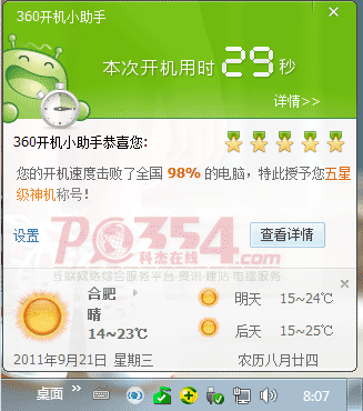 開機速度已經很快了,過了WIN7的啟動動畫后大概5秒進入桌面,就已經可以正常操作了,原來進入桌面后硬盤還要狂讀一會才能操作,360開機助手提示開始用了36秒。