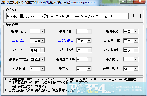 點擊 “打開”按鈕,指向新版地圖 NaviResFil文件夾中的NaviConfig.dll,確定后就可以修改常用參數了,這里主要還是修改其中的 “高清端口”,改為一樣的(本例中的
