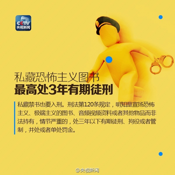 以制作、散發宣揚恐怖主義、極端主義的圖書、音頻視頻資料或者其他物品,或者通過講授、發布信息等方式宣揚恐怖主義、極端主義的,或者煽動實施恐怖活動的,處5年以下有期徒刑、拘役、管制或者剝奪政治權利,并處罰金;情節嚴重的,處5年以上有期徒刑,并處罰金或者沒收財產。明知是宣揚恐怖主義、極端主義的圖書、音頻視頻資料或者其他物品而非法持有,情節嚴重的,處3年以下有期徒刑、拘役或者管制,并處或者單處罰金。